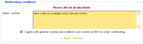 4. If you want to say something to the admins or if you have any special wish (not regarding technical or hosting matters), enter it here. If you agree with the hosting conditions (required for further continuation), check the appropriate box.